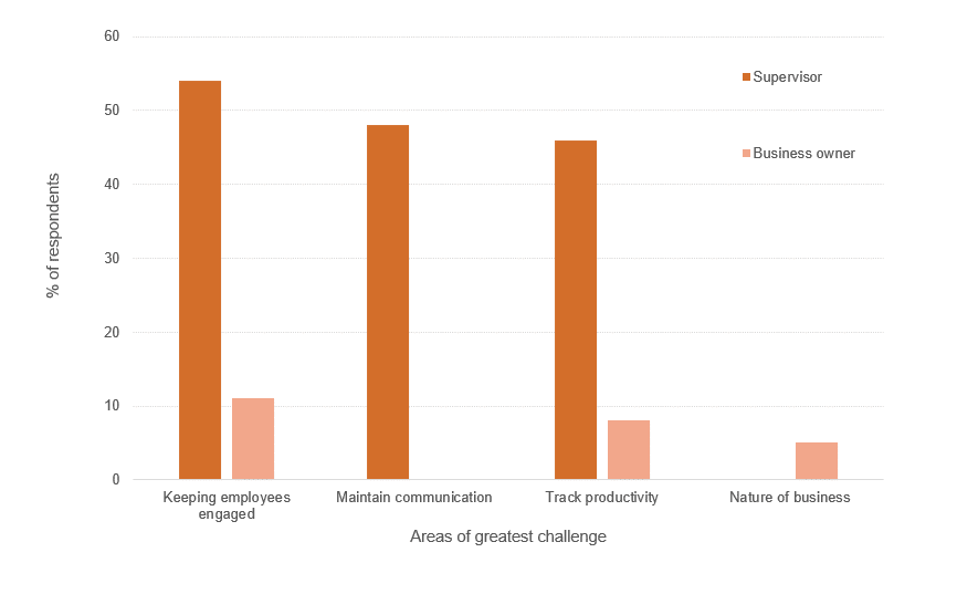 The greatest area of challenge for supervisors was indentified as keeping employees connected and engaged. This is reflected in the consistent responses from employees that they needed clearer communication from their supervisors while supervisors reported challenges in being able to communicate effectively with the employees they supervised.